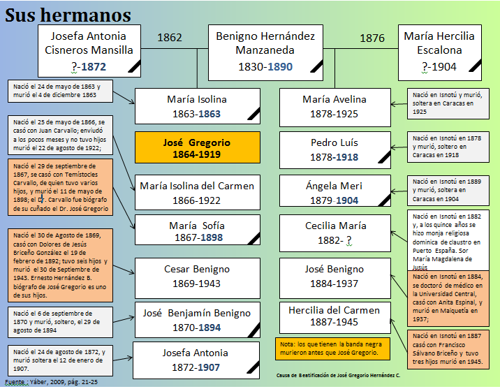 De la familia de José Gregorio he seleccionado algunos de sus miembros cuyas vidas las he considerado interesantes y dignas de ser narradas, por lo tanto he tomado pequeñas pinceladas de sus vidas en algunas anécdotas, todas tomados del libro de su sobrino Ernesto Hernández Briceño "Nuestro tío Jose Gregorio" con excepción de uno de sus hermanos.